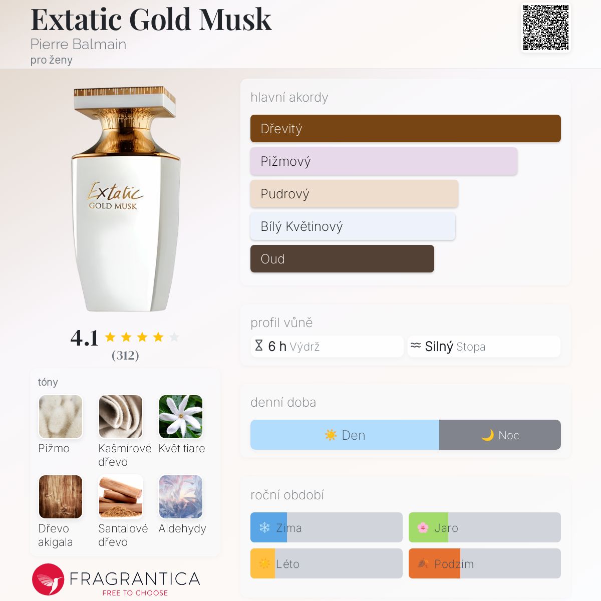 Extatic Gold Musk podle Pierre Balmain je Floral Woody Musk vůně pro ženy. Extatic Gold Musk byl/a uveden/a v roce 2016. "Nosem" za touto vůní je Sonia Constant. Vrchní tóny jsou Aldehydy a Bergamot; střední tóny jsouKašmírové dřevo, Květ tiare a Dřevo akigala ; základní tóny jsou Pižmo, Santalové dřevo a Pryskyřice.