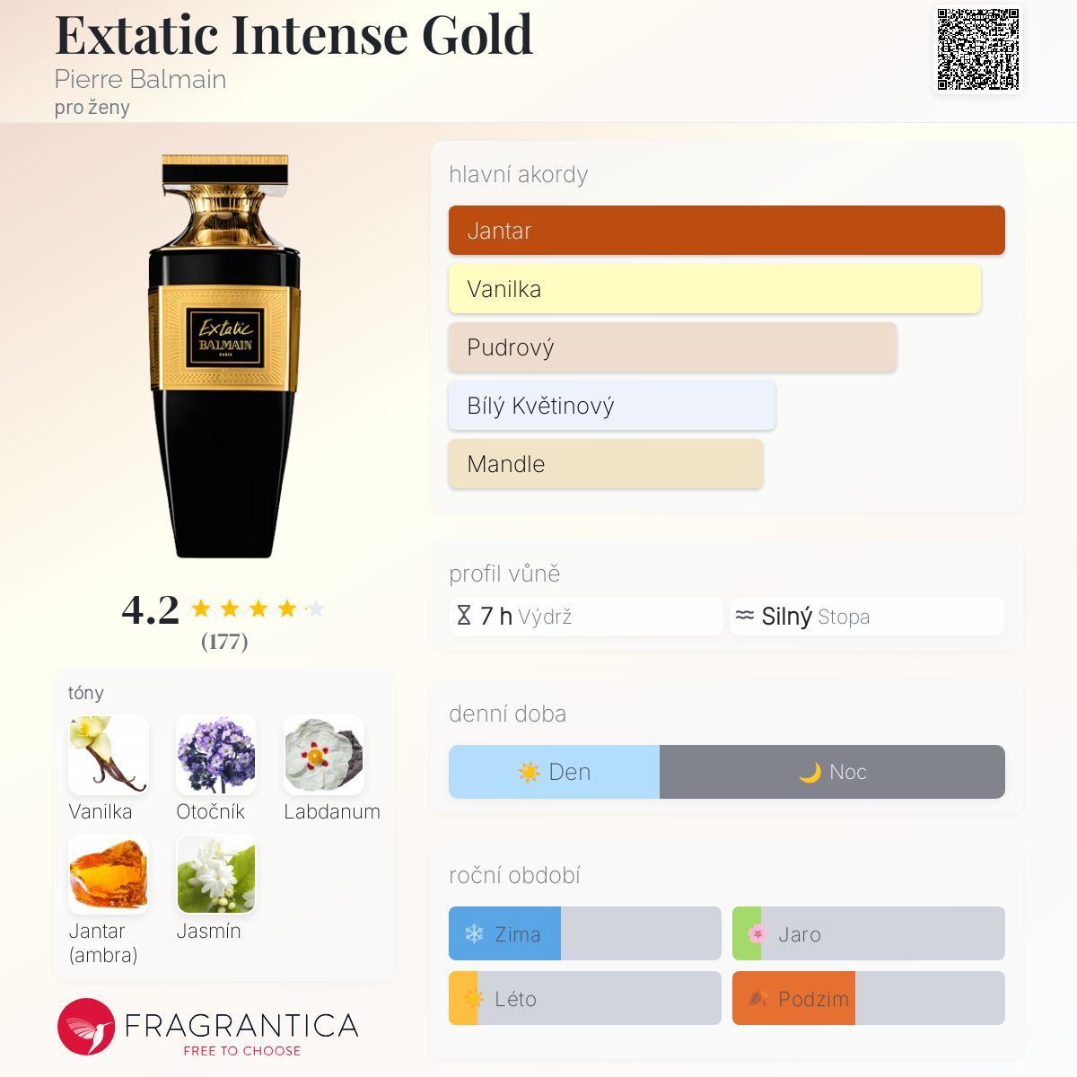 Extatic Intense Gold podle Pierre Balmain je Orientální Floral vůně pro ženy. Extatic Intense Gold byl/a uveden/a v roce 2014. Vrchní tón je Jasmín ; střední tóny jsouVanilkový květ a Otočník ; základní tóny jsou Labdanum a Jantar (ambra).