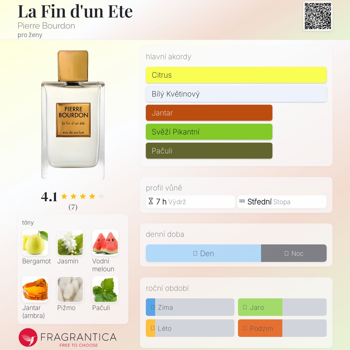 La Fin d'un Ete podle Pierre Bourdon je Floral Fruity vůně pro ženy. La Fin d'un Ete byl/a uveden/a v roce 2015. "Nosem" za touto vůní je Pierre Bourdon. Vrchní tón je Bergamot ; střední tóny jsouJasmín a Vodní meloun ; základní tóny jsou Jantar (ambra), Pižmo a Pačuli.