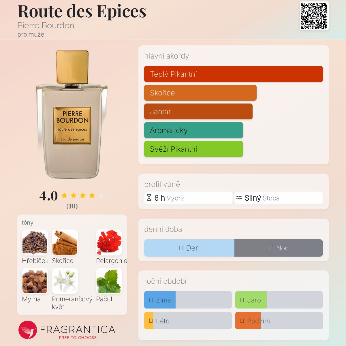 Route des Epices podle Pierre Bourdon je Aromatic Spicy vůně pro muže. Route des Epices byl/a uveden/a v roce 2015. "Nosem" za touto vůní je Pierre Bourdon. Vrchní tón je Pelargónie ; střední tóny jsouHřebíček, Skořice a Pomerančový květ ; základní tóny jsou Myrha, Pačuli a Kadidlo.