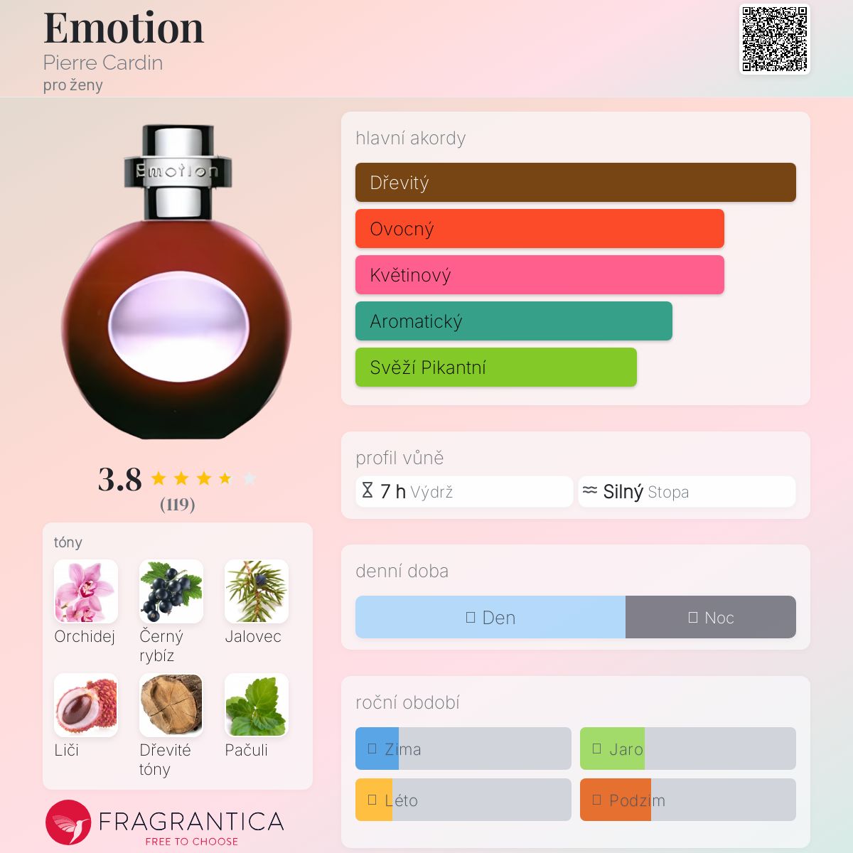 Emotion podle Pierre Cardin je Chypre Floral vůně pro ženy. Emotion byl/a uveden/a v roce 2005. Vrchní tóny jsou Černý rybíz, Jalovec a Liči; střední tóny jsouOrchidej, Lotus a Jasmín ; základní tóny jsou Dřevité tóny, Pačuli a Jantar (ambra).