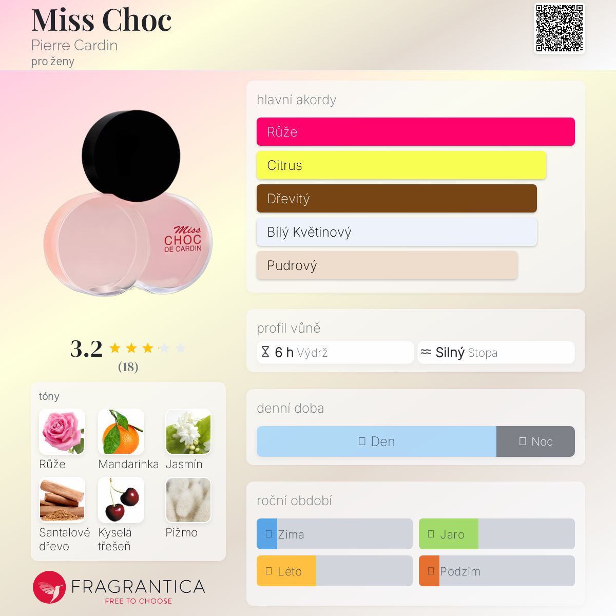 Miss Choc podle Pierre Cardin je Floral Fruity vůně pro ženy. Miss Choc byl/a uveden/a v roce 2012. Vrchní tóny jsou Mandarinka a Kyselá třešeň; střední tóny jsouRůže a Jasmín ; základní tóny jsou Santalové dřevo a Pižmo.