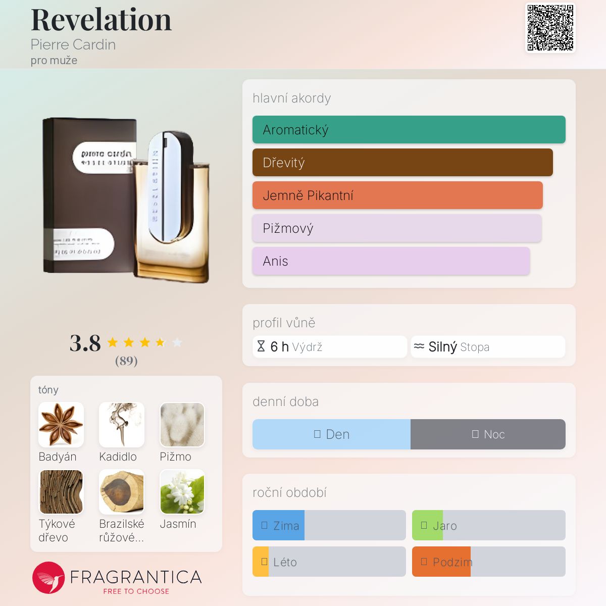 Revelation podle Pierre Cardin je Orientální Spicy vůně pro muže. Revelation byl/a uveden/a v roce 2004. "Nosem" za touto vůní je Daniel Moliere. Vrchní tóny jsou Badyán, Pelyněk, Máta a Růžový grapefruit; střední tóny jsouKadidlo, Týkové dřevo, Jasmín a Bazalka ; základní tóny jsou Pižmo, Brazilské růžové dřevo a Šalvěj.