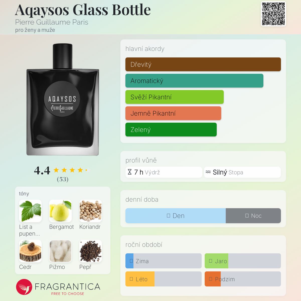 Aqaysos Glass Bottle podle Pierre Guillaume Paris je Floral Woody Musk vůně pro ženy a muže. Aqaysos Glass Bottle byl/a uveden/a v roce 2017. "Nosem" za touto vůní je Pierre Guillaume. Vrchní tón je Bergamot ; střední tóny jsouKasie, Koriandr a Pepř ; základní tóny jsou Cedr, Bílé pižmo, Borovice, Dřevité tóny a Pačuli.