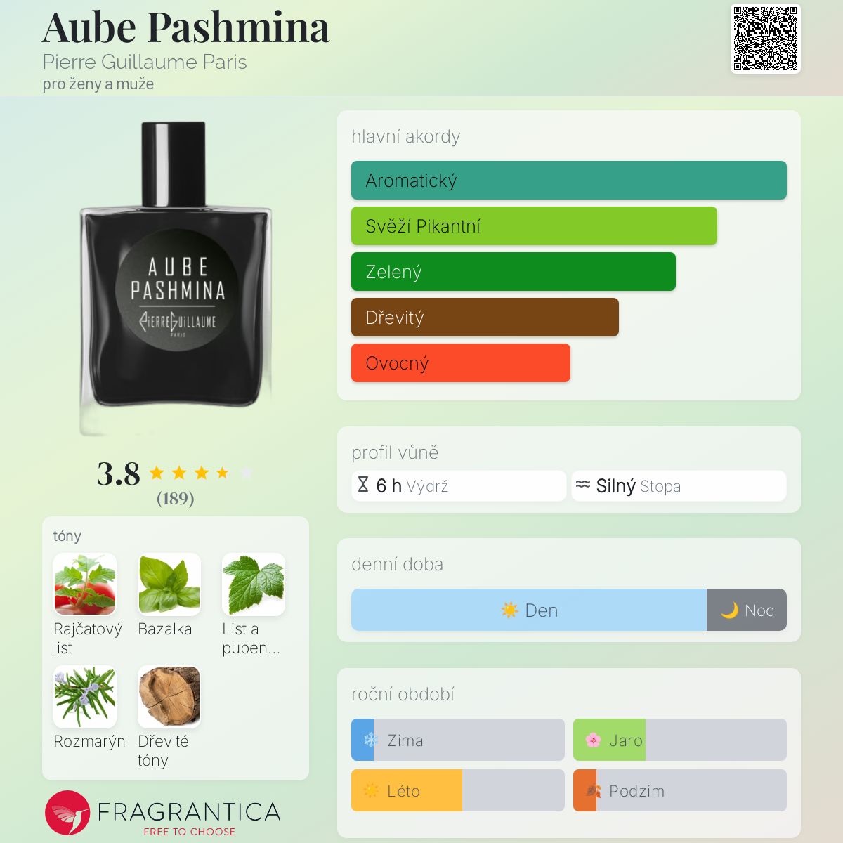Aube Pashmina podle Pierre Guillaume Paris je Aromatic Fruity vůně pro ženy a muže. Aube Pashmina byl/a uveden/a v roce 2010. "Nosem" za touto vůní je Pierre Guillaume.