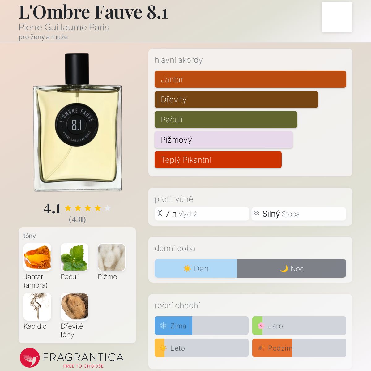 L'Ombre Fauve 8.1 podle Pierre Guillaume Paris je Orientální Woody vůně pro ženy a muže. L'Ombre Fauve 8.1 byl/a uveden/a v roce 2007. "Nosem" za touto vůní je Pierre Guillaume.