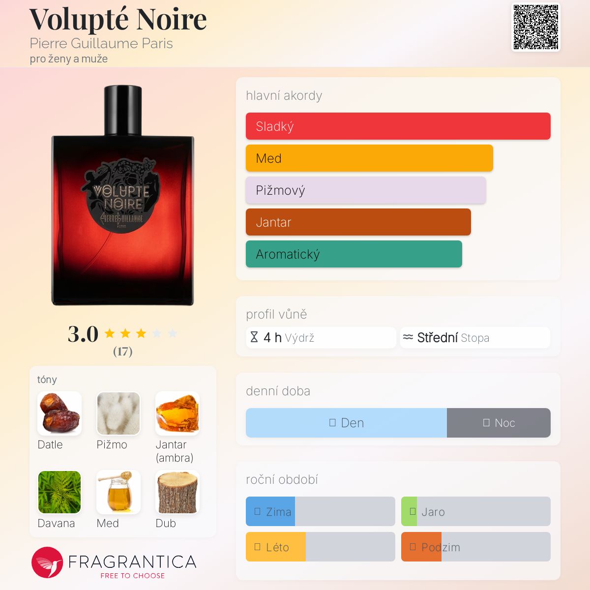 Volupté Noire podle Pierre Guillaume Paris je Orientální Floral vůně pro ženy a muže. Toto je nová vůně. Volupté Noire byl/a uveden/a v roce 2025. "Nosem" za touto vůní je Pierre Guillaume. Vrchní tóny jsou Datle, Davana a Bergamot; střední tóny jsouAkát, Lipový květ a Jasmín ; základní tóny jsou Pižmo, Jantar (ambra), Med, Dub a Pryšec.