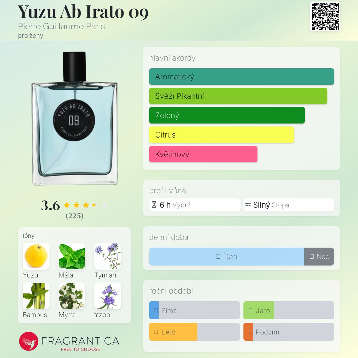 Yuzu Ab Irato 09 podle Pierre Guillaume Paris je Floral Green vůně pro ženy. Yuzu Ab Irato 09 byl/a uveden/a v roce 2006. "Nosem" za touto vůní je Pierre Guillaume. Vrchní tóny jsou Yuzu a Máta; střední tóny jsouPepř, Magnólie, Hyacint a Jasmín ; základní tóny jsou Tymián, Bambus, Myrta a Yzop.