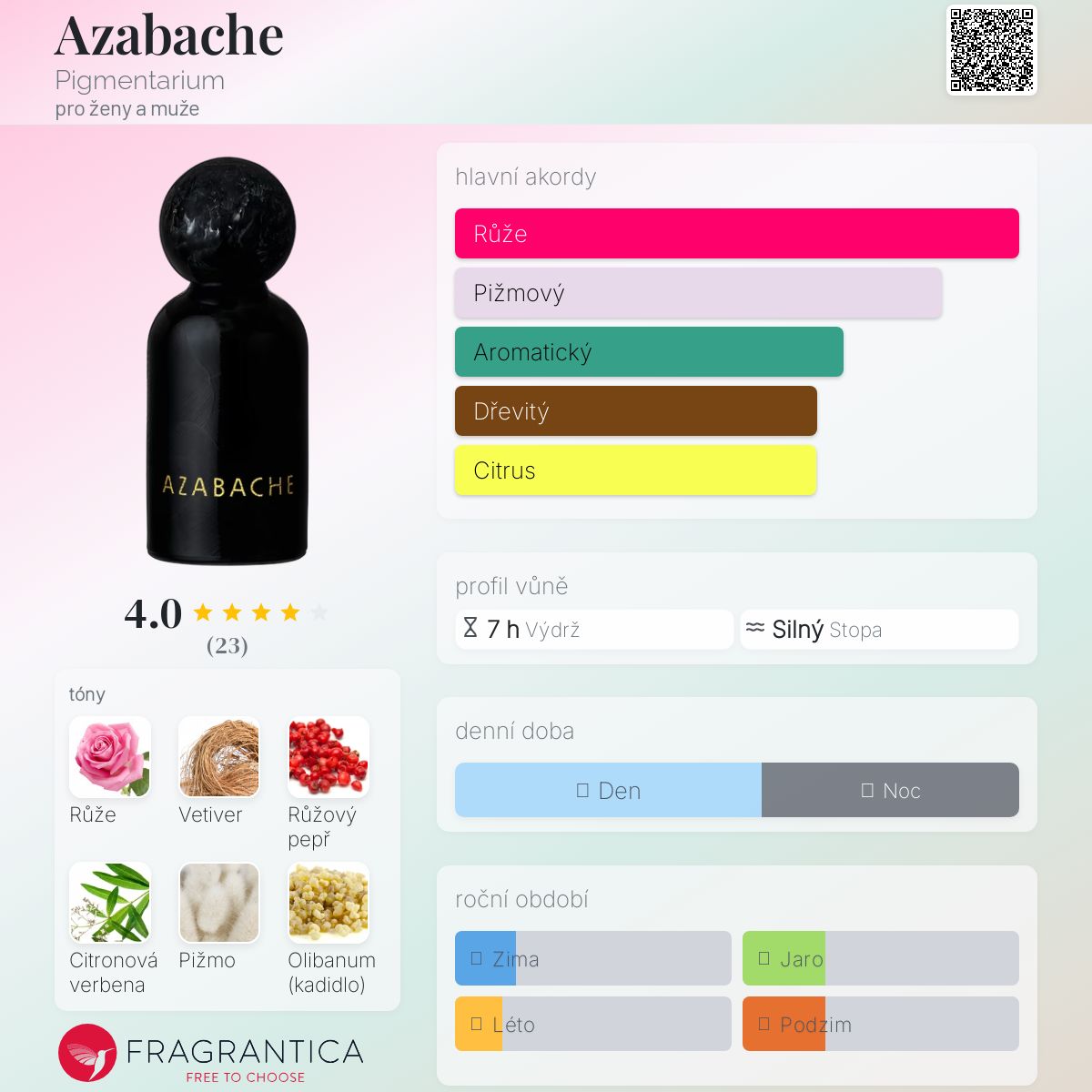 Azabache podle Pigmentarium je vůně pro ženy a muže. Azabache byl/a uveden/a v roce 2021. "Nosem" za touto vůní je Jakub F. Hiermann. Vrchní tóny jsou Růžový pepř a Sporýš; střední tóny jsouRůže de Mai, Turecká růže a Růžový olej ; základní tóny jsou Vetiver, Pižmo, Olibanum a Cibetka.