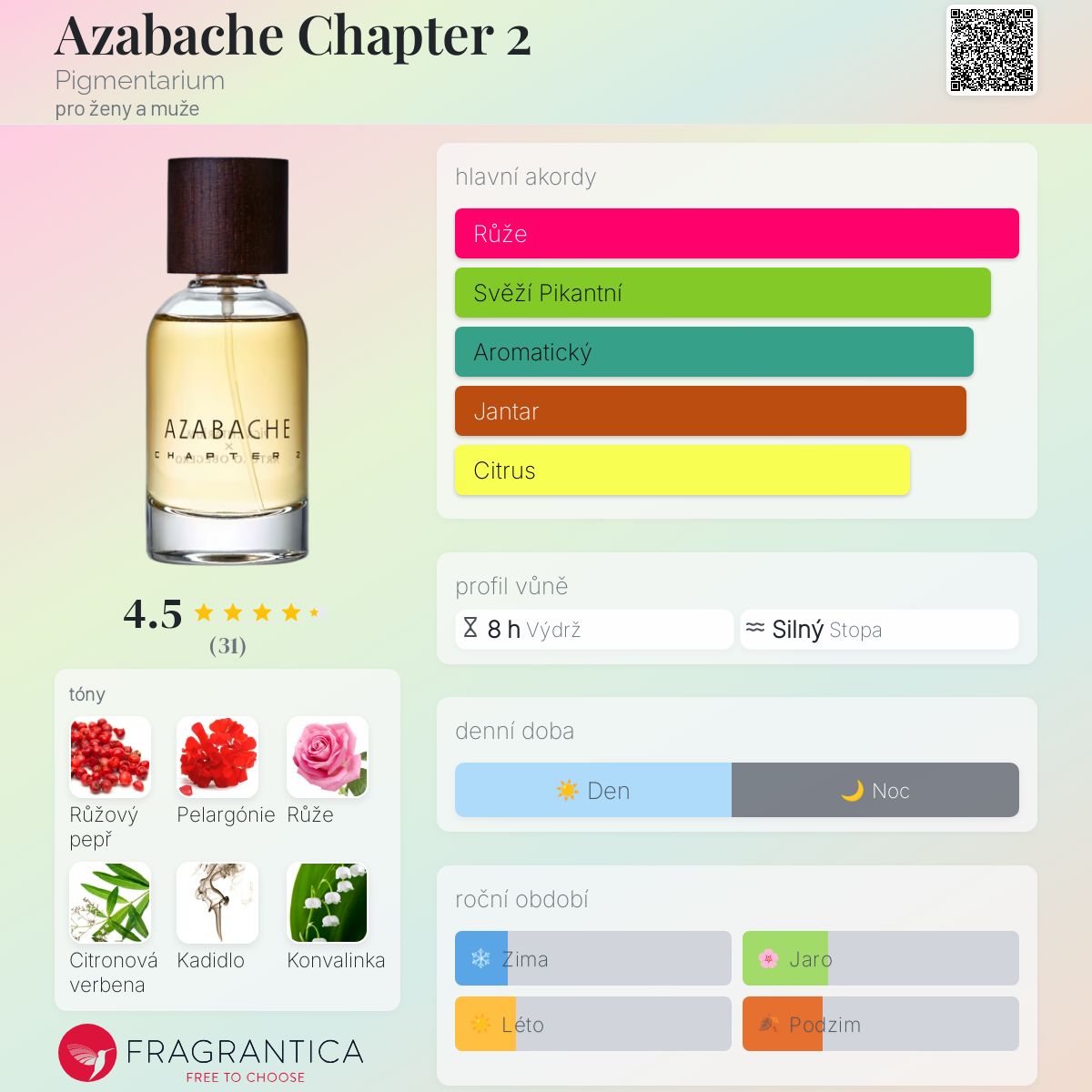 Azabache Chapter 2 podle Pigmentarium je vůně pro ženy a muže. Toto je nová vůně. Azabache Chapter 2 byl/a uveden/a v roce 2024. "Nosem" za touto vůní je Arturo Obegero. Vrchní tóny jsou Růžový pepř, Pelargónie a Bergamot; střední tóny jsouRůže, Sporýš, Konvalinka, Fialkový list a Jasmín ; základní tóny jsou Kadidlo, Labdanum, Cedr, Pižmo, Vetiver, Myrha a Jantar (ambra).