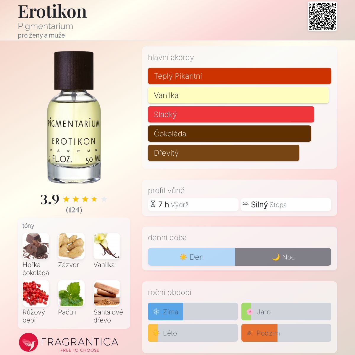 Erotikon podle Pigmentarium je vůně pro ženy a muže. Erotikon byl/a uveden/a v roce 2019. "Nosem" za touto vůní je Jakub F. Hiermann. Vrchní tóny jsou Čokoláda, Zázvor a Růžový pepř; střední tóny jsouVanilka a Fazole tonka ; základní tóny jsou Pačuli, Santalové dřevo, Jantar (ambra) a Pižmo.