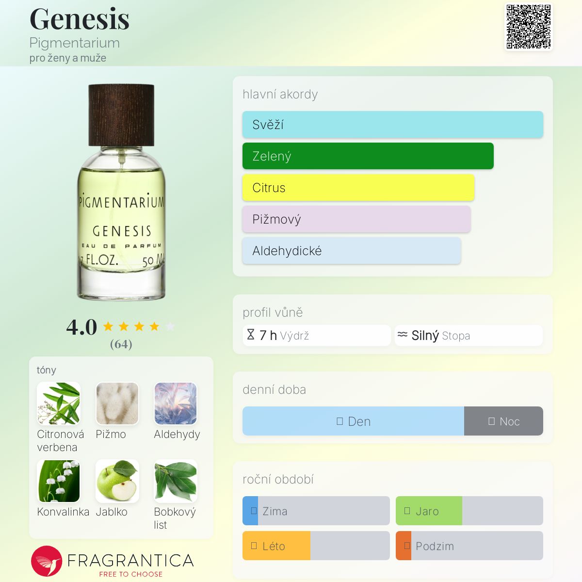 Genesis podle Pigmentarium je vůně pro ženy a muže. Genesis byl/a uveden/a v roce 2022. "Nosem" za touto vůní je Jakub F. Hiermann. Vrchní tóny jsou Aldehydy a Vavříny; střední tóny jsouSporýš, Konvalinka a Zelené jablko ; základní tóny jsou Pižmo, Fíkový list, Palisandr a Jantar (ambra).