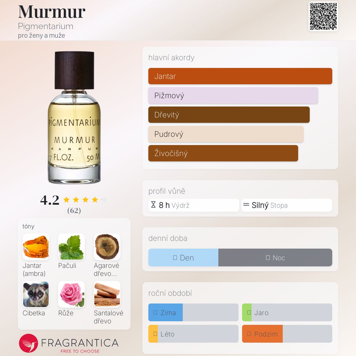 Murmur podle Pigmentarium je vůně pro ženy a muže. Murmur byl/a uveden/a v roce 2019. Vrchní tón je Jantar (ambra) ; střední tóny jsouPačuli a Růže ; základní tóny jsou Agarové dřevo (oud), Cibetka, Santalové dřevo a Pižmo.