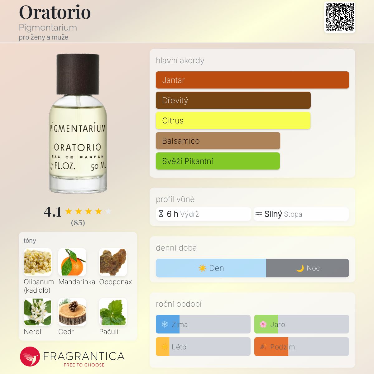 Oratorio podle Pigmentarium je vůně pro ženy a muže. Oratorio byl/a uveden/a v roce 2023. "Nosem" za touto vůní je Théo Belmas. Vrchní tóny jsou Mandarinka a Neroli; střední tóny jsouOlibanum, Cedr, Atlasový cedr a Jasmín ; základní tóny jsou Opoponax a Pačuli.