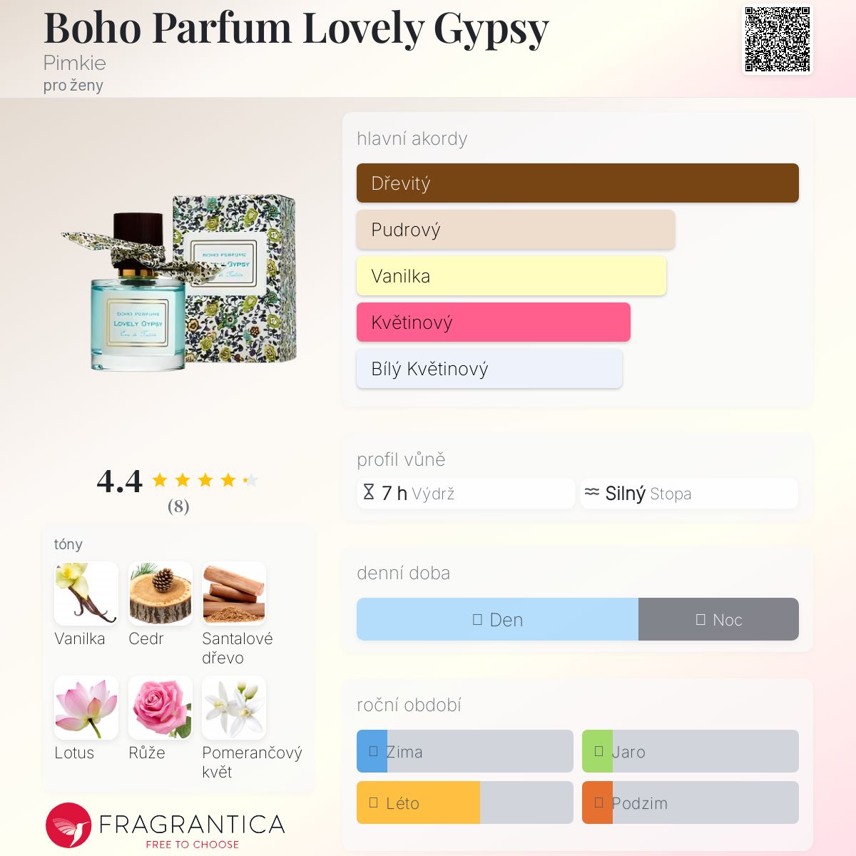 Boho Parfum Lovely Gypsy podle Pimkie je Floral Fruity vůně pro ženy. Boho Parfum Lovely Gypsy byl/a uveden/a v roce 2011. Vrchní tóny jsou Mořská voda, Broskev a Hruška; střední tóny jsouLotus, Růže a Pomerančový květ ; základní tóny jsou Vanilka, Cedr a Santalové dřevo.