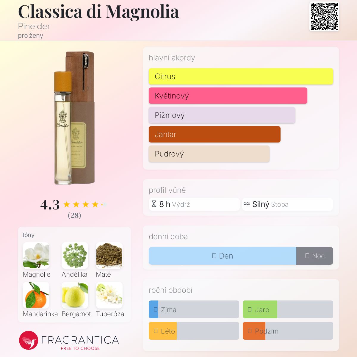 Classica di Magnolia podle Pineider je Floral vůně pro ženy. Classica di Magnolia byl/a uveden/a v roce 2012. Vrchní tóny jsou Magnólie, Mandarinka a Bergamot; střední tóny jsouAndělika, Tuberóza a Růže ; základní tóny jsou Maté a Pačuli.