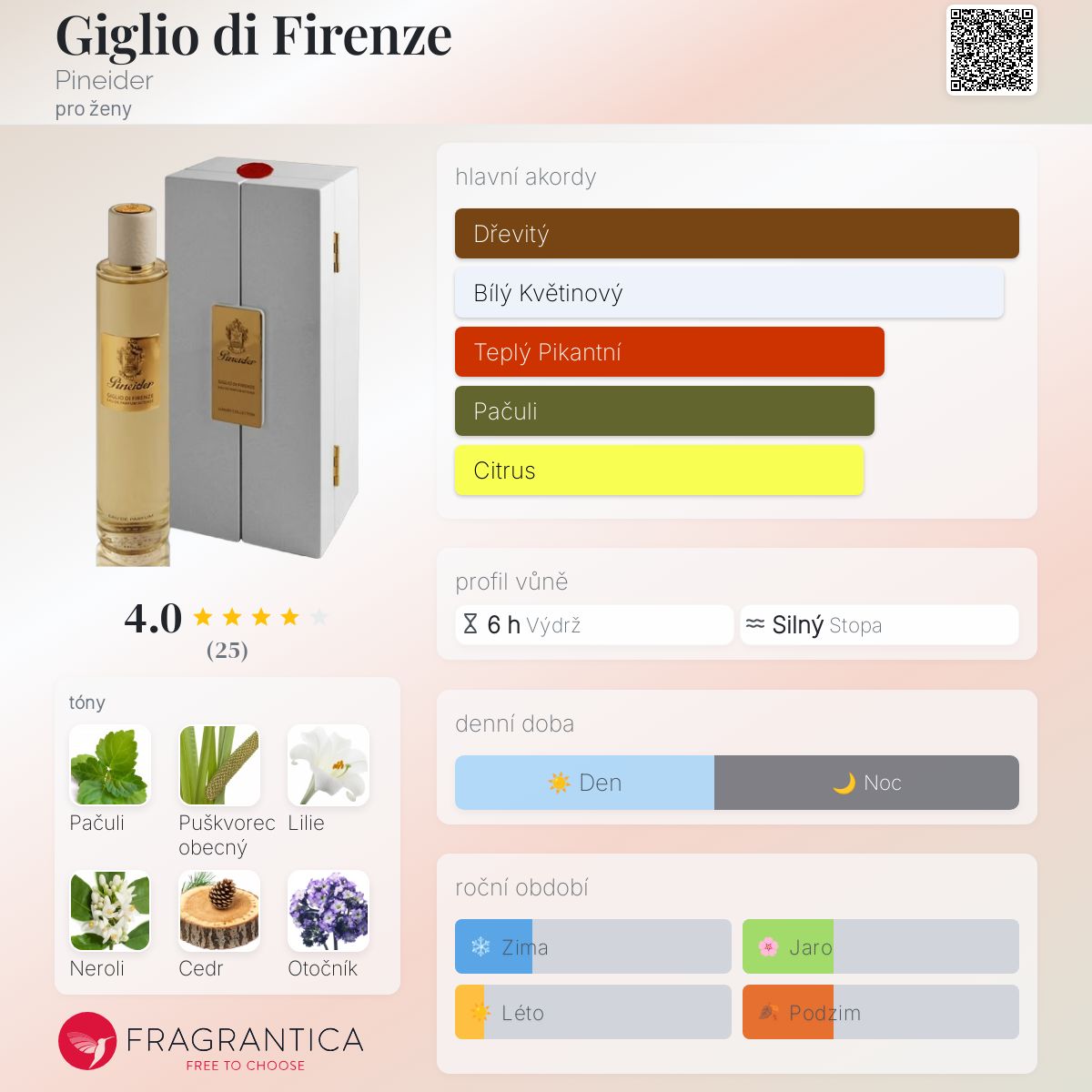 Giglio di Firenze podle Pineider je Floral Woody Musk vůně pro ženy. Giglio di Firenze byl/a uveden/a v roce 2016. "Nosem" za touto vůní je Maurizio Cerizza. Vrchní tóny jsou Puškvorec obecný, Neroli, Žlutá mandarinka a Bergamot; střední tóny jsouLilie, Otočník a Pomerančový květ ; základní tóny jsou Pačuli, Virginský cedr, Vanilka a Pižmo.