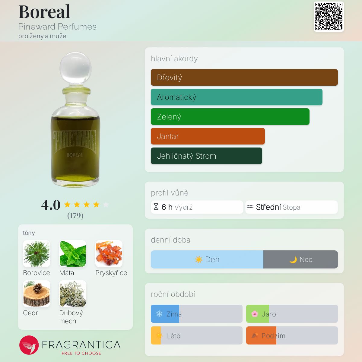 Boreal podle Pineward Perfumes je Woody Aromatic vůně pro ženy a muže. Boreal byl/a uveden/a v roce 2020. "Nosem" za touto vůní je Nicholas Nilsson.