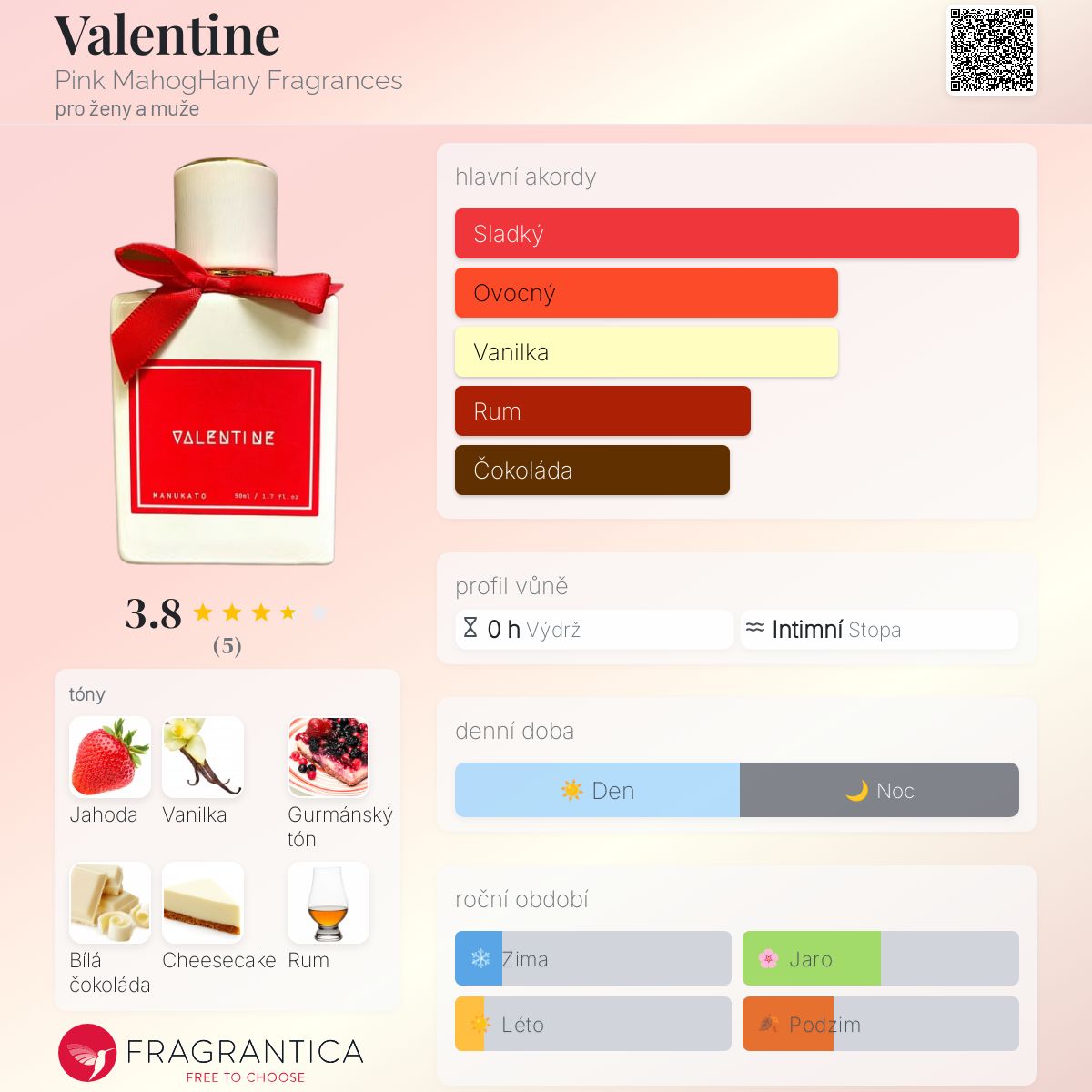 Valentine podle Pink MahogHany Fragrances je vůně pro ženy a muže. Toto je nová vůně. Valentine byl/a uveden/a v roce 2024. "Nosem" za touto vůní je Chavalia Mwamba. Vrchní tóny jsou Jahoda, Rum, Čerstvá smetana a Citrónová kůra; střední tóny jsouGurmánský tón, Cheesecake, Máslo a Růže ; základní tóny jsou Vanilka, Bílá čokoláda, Pižmo a Santalové dřevo.