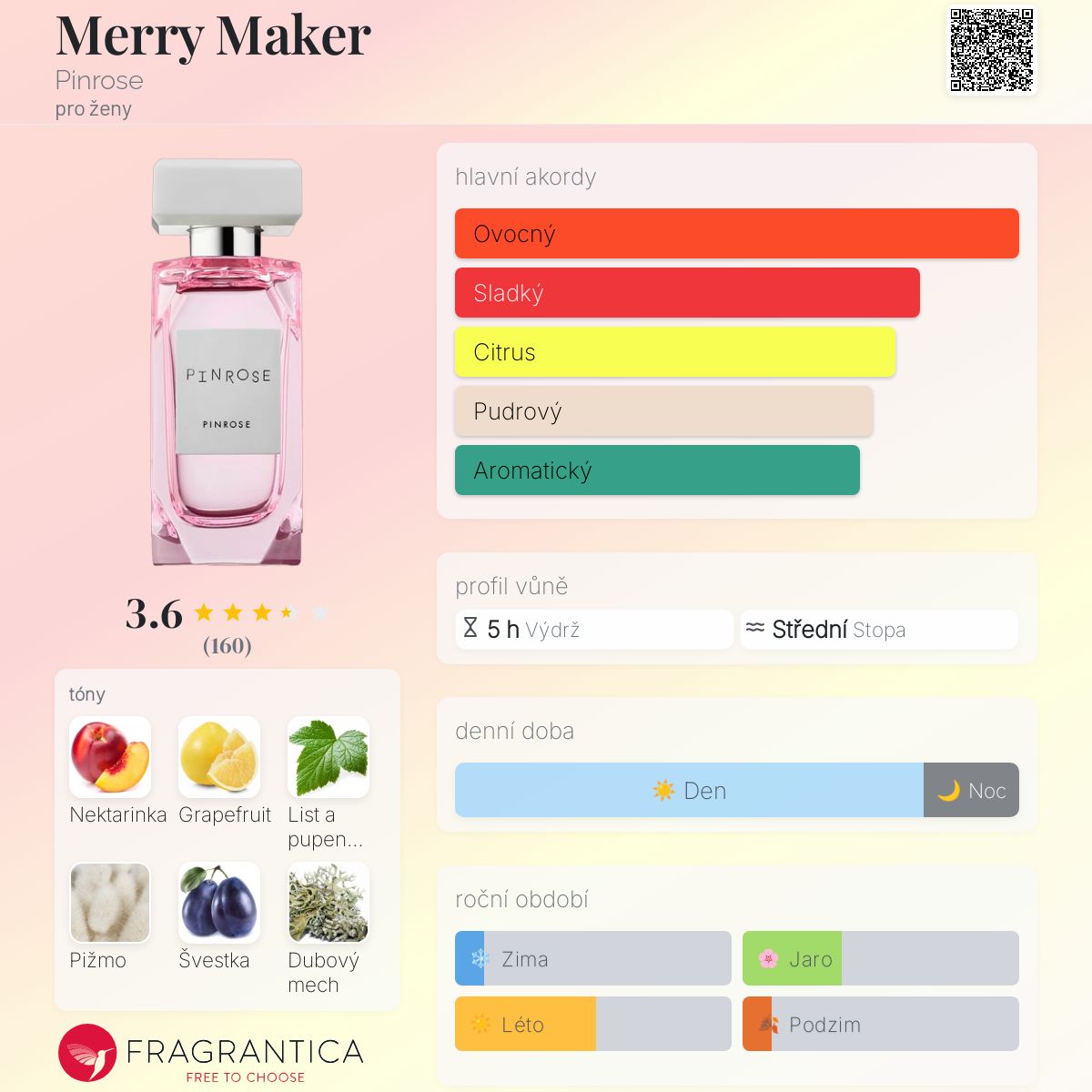 Merry Maker podle Pinrose je Aromatic Fruity vůně pro ženy. Merry Maker byl/a uveden/a v roce 2014. "Nosem" za touto vůní je Christelle Laprade. Vrchní tóny jsou Nektarinka, Grapefruit a Černý rybíz; střední tóny jsouŠvestka, Růže a Fialka ; základní tóny jsou Pižmo, Mech a Fazole tonka.