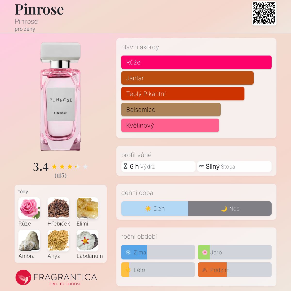 Pinrose podle Pinrose je Floral vůně pro ženy. Pinrose byl/a uveden/a v roce 2014. "Nosem" za touto vůní je David Apel. Vrchní tóny jsou Bulharská růže, Elemi a Anýz; střední tóny jsouRůže, Hřebíček a Kosatec ; základní tóny jsou Ambra, Labdanum a Vanilka.