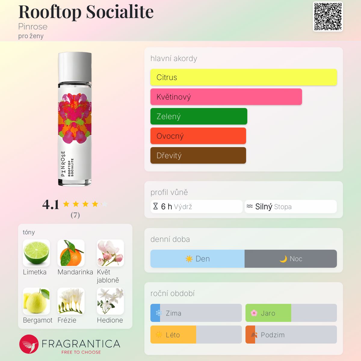 Rooftop Socialite podle Pinrose je Floral Woody Musk vůně pro ženy. Rooftop Socialite byl/a uveden/a v roce 2014. "Nosem" za touto vůní je Ilias Ermenidis. Vrchní tóny jsou Limetka, Mandarinka a Bergamot; střední tóny jsouKvět jabloně , Frézie a Hedione ; základní tóny jsou Bílé pižmo a Cedr.