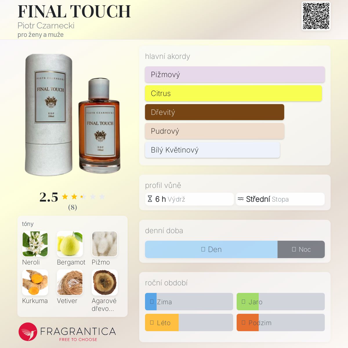 FINAL TOUCH podle Piotr Czarnecki je Woody Floral Musk vůně pro ženy a muže. FINAL TOUCH byl/a uveden/a v roce 2022. "Nosem" za touto vůní je Piotr Czarnecki. Vrchní tóny jsou Neroli, Bergamot a Jasmín; střední tóny jsouKurkuma, Vetiver a Meruňka ; základní tóny jsou Bílé pižmo, Agarové dřevo (oud), Koňak a Cibetka.