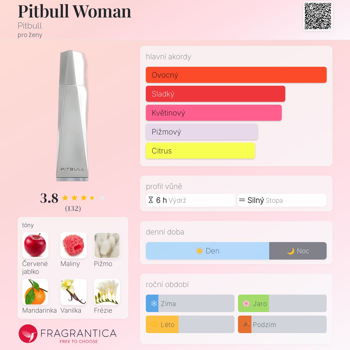 Pitbull Woman podle Pitbull je Floral Fruity vůně pro ženy. Pitbull Woman byl/a uveden/a v roce 2013. Vrchní tóny jsou Červené jablko, Maliny a Mandarinka; střední tóny jsouFrézie, Bílý květ broskvoně a Jasmín ; základní tóny jsou Pižmo, Vanilka, Dřevité tóny a Jantar (ambra).