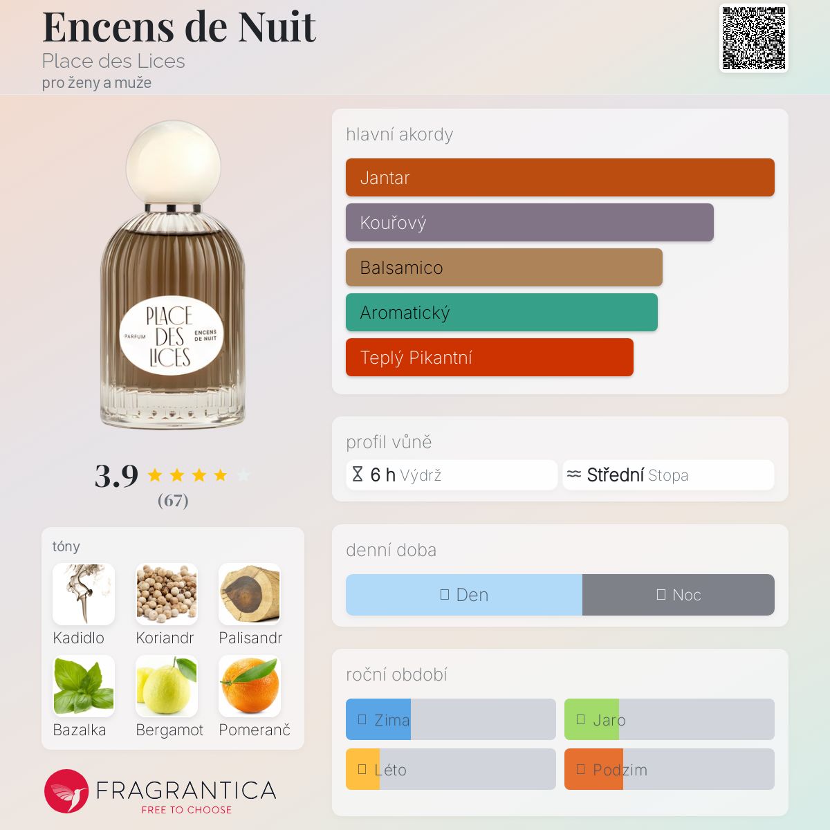 Encens de Nuit začíná více svěže a smrkově, postupně přechází v dřevité a peprné a zjevně hřejivé, ale zdaleka ne palčivé nebo kouřové kadidlo.