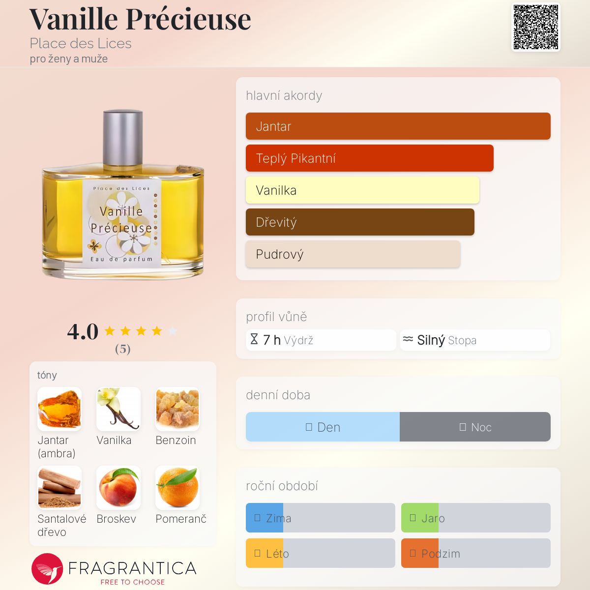 Vanille Précieuse podle Place des Lices je Floral Fruity Gourmand vůně pro ženy a muže. Vanille Précieuse byl/a uveden/a v roce 2012. "Nosem" za touto vůní je Marie Duchêne.