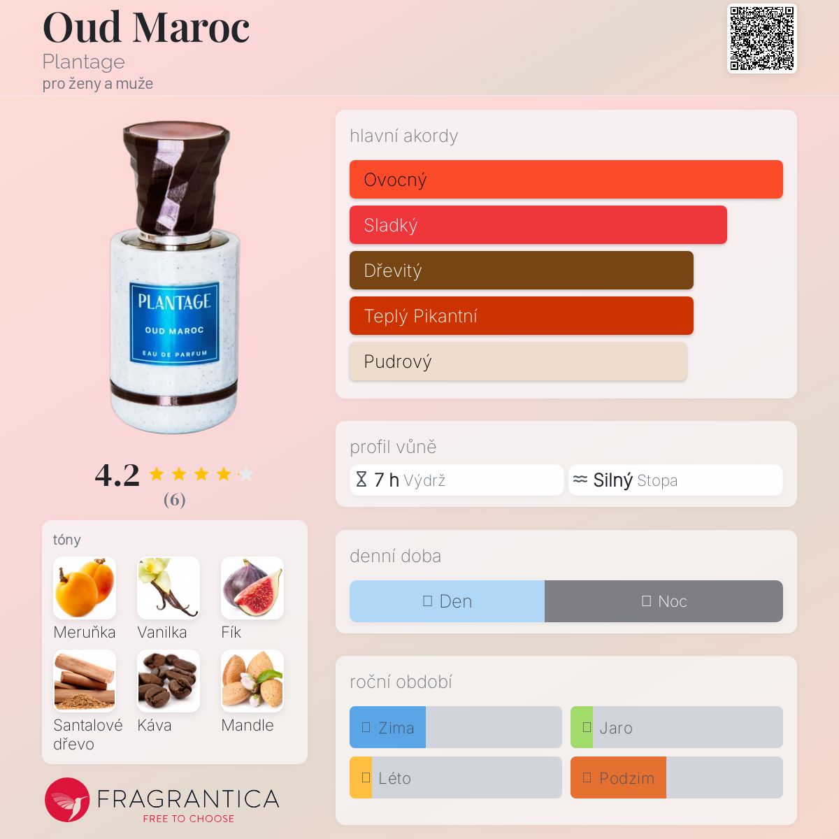 Oud Maroc podle Plantage je Orientální Vanilla vůně pro ženy a muže. Oud Maroc byl/a uveden/a v roce 2023. Vrchní tóny jsou Meruňka, Fík, Káva a Mandle; střední tóny jsouKvět tiare, Šuškarda, Okvětní lístky růží, Vlašský ořech, Muškátový oříšek a Skořice ; základní tóny jsou Vanilka, Santalové dřevo, Myrha, Agarové dřevo (oud) a Kakao.