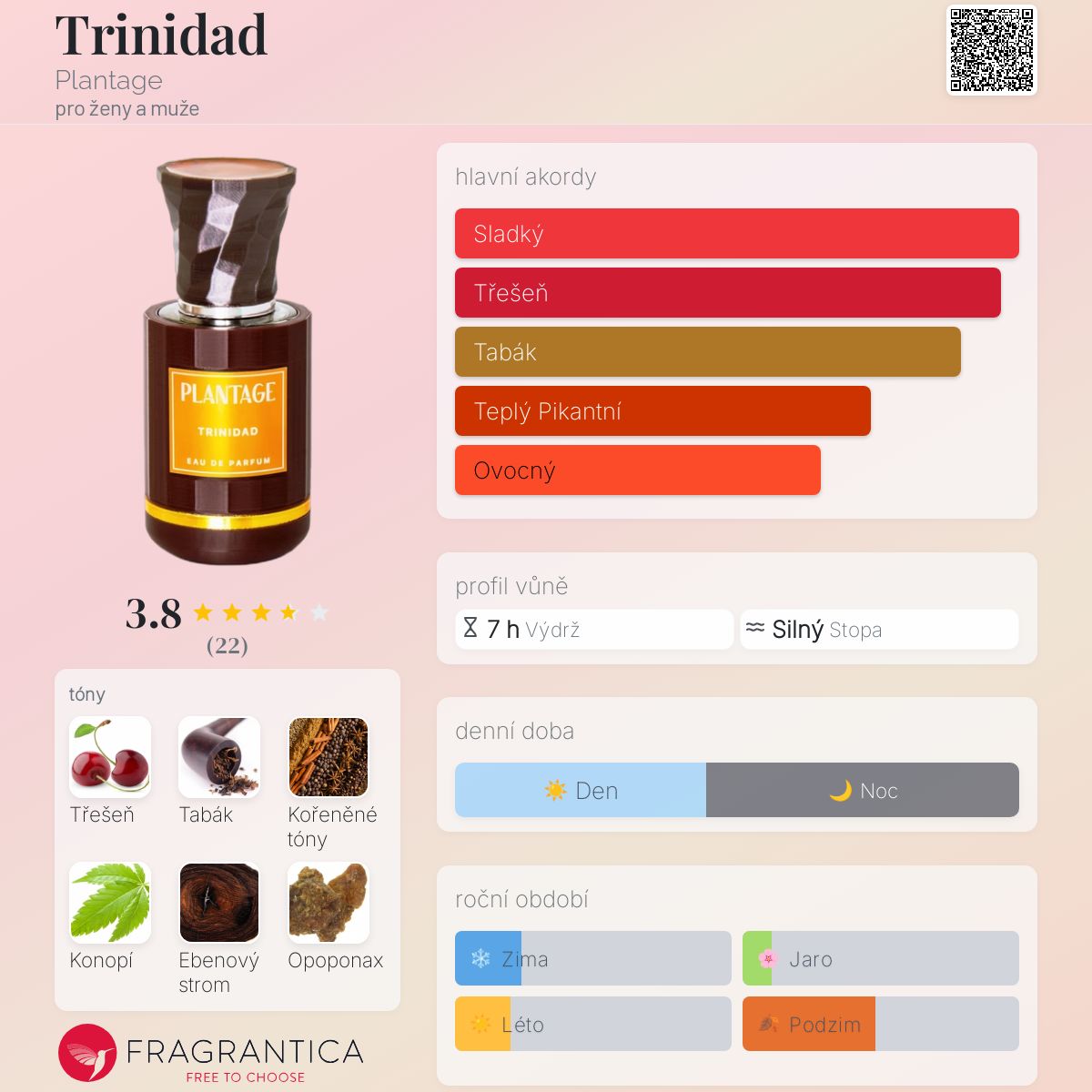 Trinidad podle Plantage je Orientální Vanilla vůně pro ženy a muže. Trinidad byl/a uveden/a v roce 2023. Vrchní tóny jsou Konopí, Grapefruit a Karamel; střední tóny jsouTřešeň, Tabák, Koření, Vonokvětka, Zelené jablko a Broskev ; základní tóny jsou Eben, Opoponax, Čokoláda a Fazole tonka.