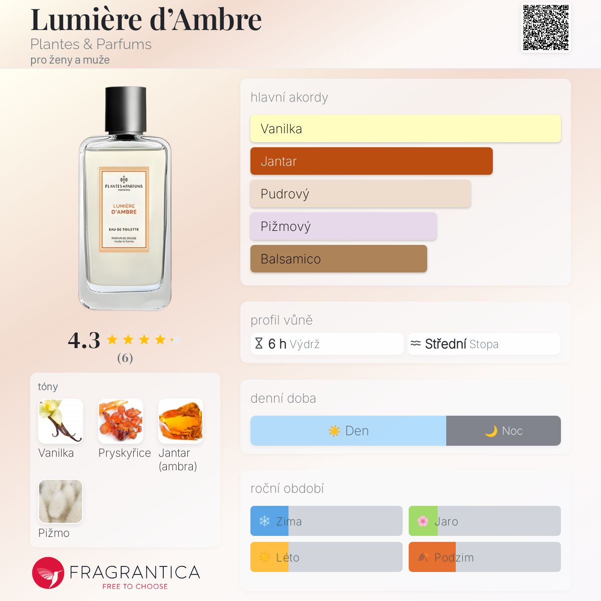 Lumière d’Ambre podle Plantes & Parfums je Orientální Vanilla vůně pro ženy a muže. Vrchní tón je Pryskyřice ; střední tón jeVanilka ; základní tóny jsou Jantar (ambra) a Pižmo.
