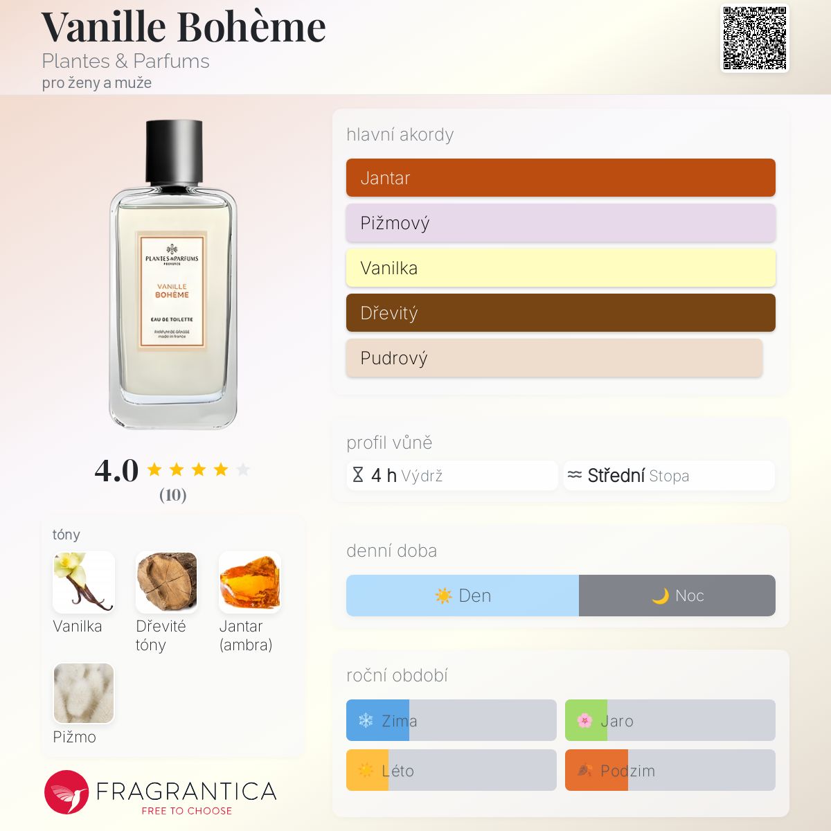 Vanille Bohème podle Plantes & Parfums je Orientální Vanilla vůně pro ženy a muže. Vrchní tón je Vanilkový lusk ; střední tón jeVanilkový květ ; základní tóny jsou Dřevité tóny, Jantar (ambra) a Pižmo.