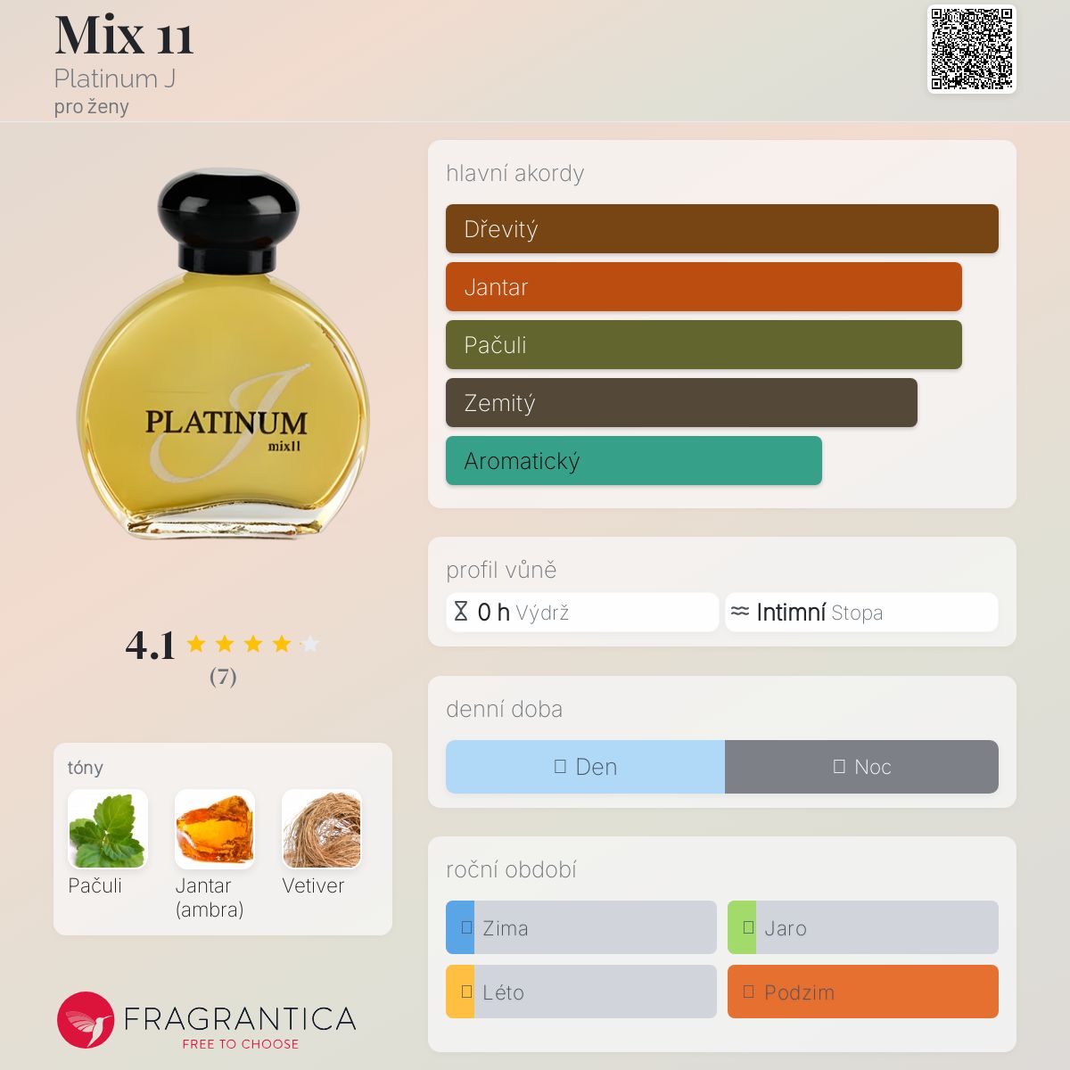 Mix 11 podle Platinum J je Orientální Woody vůně pro ženy. Mix 11 byl/a uveden/a v roce 2010. "Nosem" za touto vůní je Jacqueline Clemens.