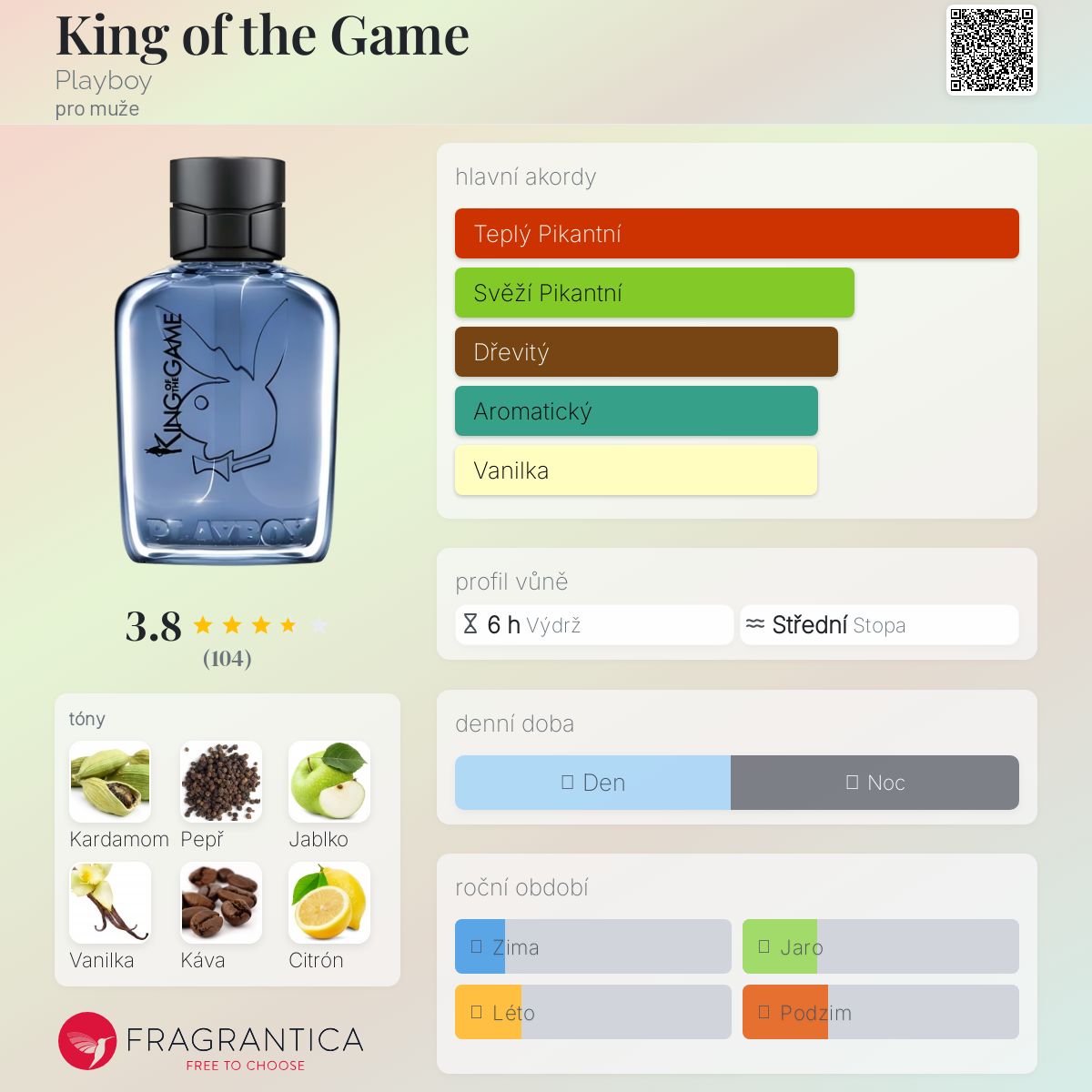 King of the Game podle Playboy je Aromatic Spicy vůně pro muže. King of the Game byl/a uveden/a v roce 2016. Vrchní tóny jsou Kardamom, Černý pepř a Citrón; střední tóny jsouGranny Smith jablko a Káva ; základní tóny jsou Vanilka, Pačuli a Cedr.