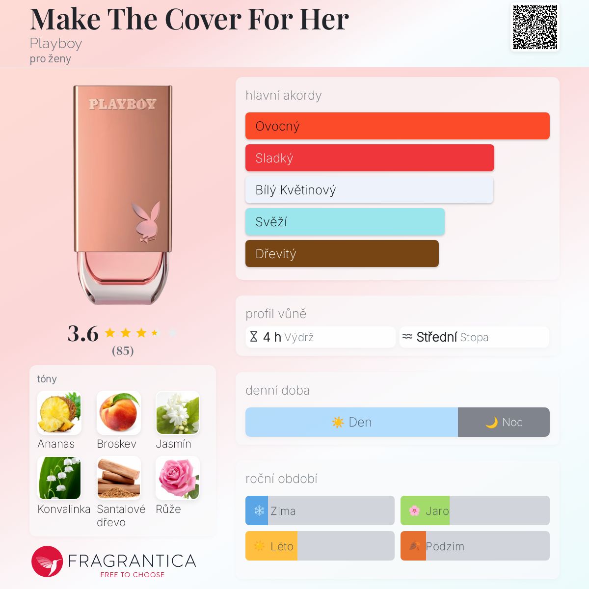 Make The Cover For Her podle Playboy je Floral Fruity vůně pro ženy. Make The Cover For Her byl/a uveden/a v roce 2020. Vrchní tóny jsou Ananas, Broskev a Bergamot; střední tóny jsouJasmín Sambac, Konvalinka a Růže ; základní tóny jsou Santalové dřevo, Ambroxan a Extrakt z bílého cedru.