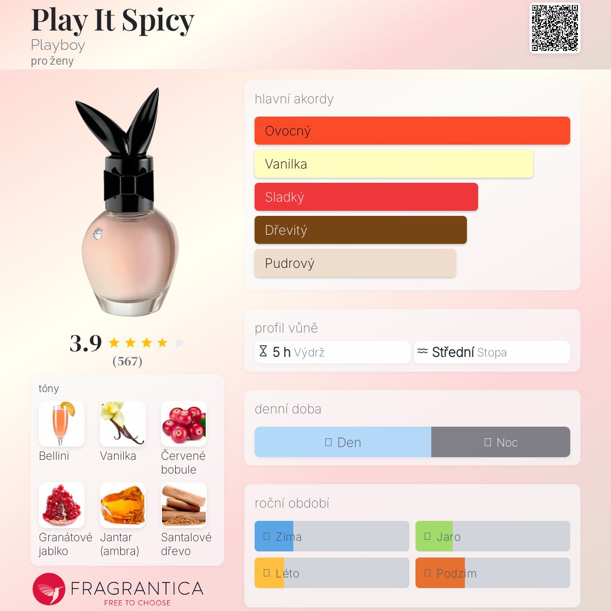 Play It Spicy podle Playboy je Orientální Floral vůně pro ženy. Play It Spicy byl/a uveden/a v roce 2010. Vrchní tóny jsou Bellini, Červené bobule a Granátové jablko; střední tóny jsouMučenka, Tygří lilie a Otočník ; základní tóny jsou Vanilka, Jantar (ambra) a Santalové dřevo.