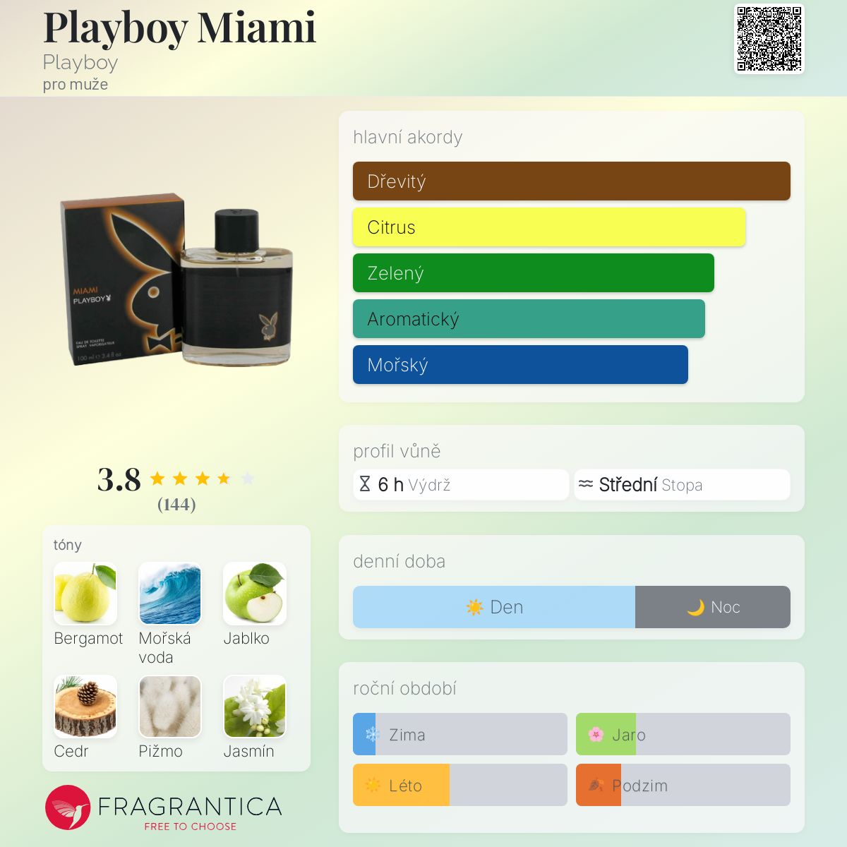 Playboy Miami podle Playboy je Woody Aromatic vůně pro muže. Playboy Miami byl/a uveden/a v roce 2008. "Nosem" za touto vůní je Dirk Braun. Vrchní tóny jsou Bergamot, Mořské tóny, Jablko a Zelené listí; střední tóny jsouJasmín, Brazilské růžové dřevo a Brambořík ; základní tóny jsou Cedr, Pižmo a Jantar (ambra).