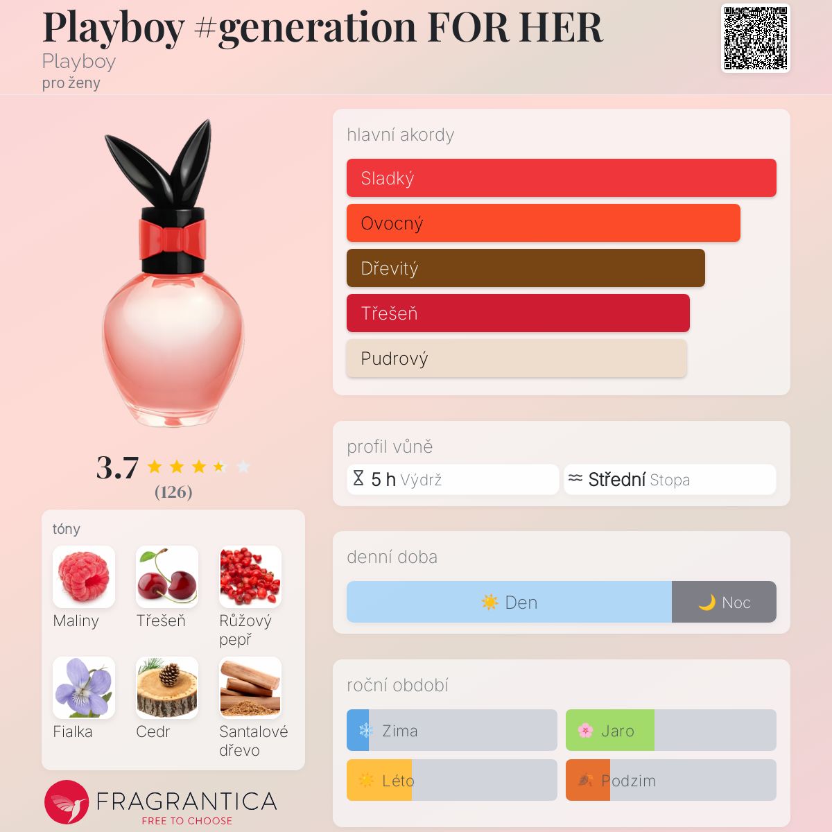 Playboy #generation FOR HER podle Playboy je Floral Fruity vůně pro ženy. Playboy #generation FOR HER byl/a uveden/a v roce 2014. "Nosem" za touto vůní je Juliette Karagueuzoglou. Vrchní tóny jsou Třešeň, Růžový pepř a Mandarinka; střední tóny jsouMaliny, Fialka a Jasmín ; základní tóny jsou Cedr, Santalové dřevo a Pižmo.