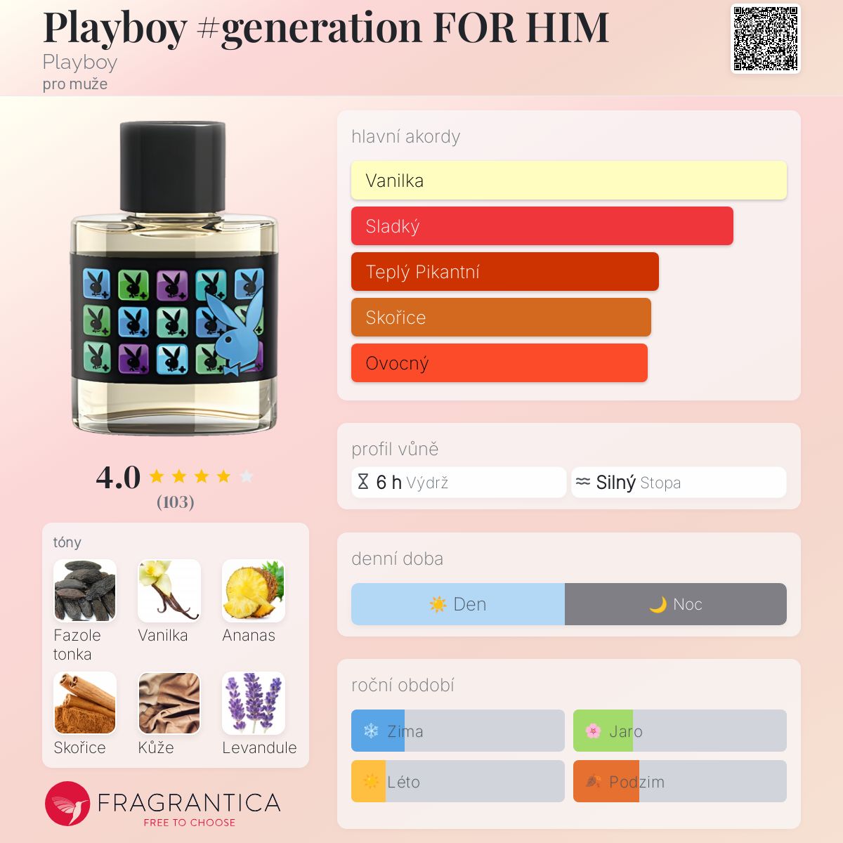 Playboy #generation FOR HIM podle Playboy je Aromatic Spicy vůně pro muže. Playboy #generation FOR HIM byl/a uveden/a v roce 2014. "Nosem" za touto vůní je Alexandra Kosinski. Vrchní tóny jsou Ananas, Skořice a Bergamot; střední tóny jsouFazole tonka, Levandule a Kašmír ; základní tóny jsou Vanilka, Kůže a Cedr.