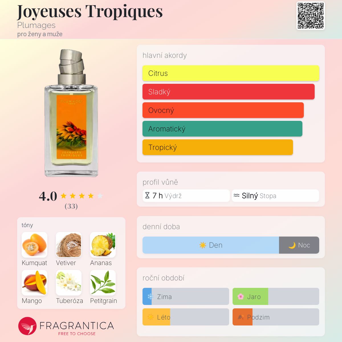 Joyeuses Tropiques podle Plumages je vůně pro ženy a muže. Joyeuses Tropiques byl/a uveden/a v roce 2019. "Nosem" za touto vůní je Bertrand Duchaufour. Vrchní tóny jsou Kumquat, Ananas a Mango; střední tóny jsouTuberóza, Paraguajský petitgrain a Zelené listí ; základní tóny jsou Haitský vetiver a Hořká čokoláda.