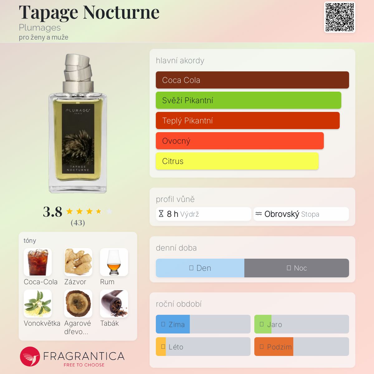 Tapage Nocturne podle Plumages je vůně pro ženy a muže. Tapage Nocturne byl/a uveden/a v roce 2019. "Nosem" za touto vůní je Anne-Sophie Behaghel. Vrchní tóny jsou Zázvor a Limetka; střední tóny jsouCoca-Cola, Vonokvětka a Káva ; základní tóny jsou Rum, Agarové dřevo (oud) a Tabák.