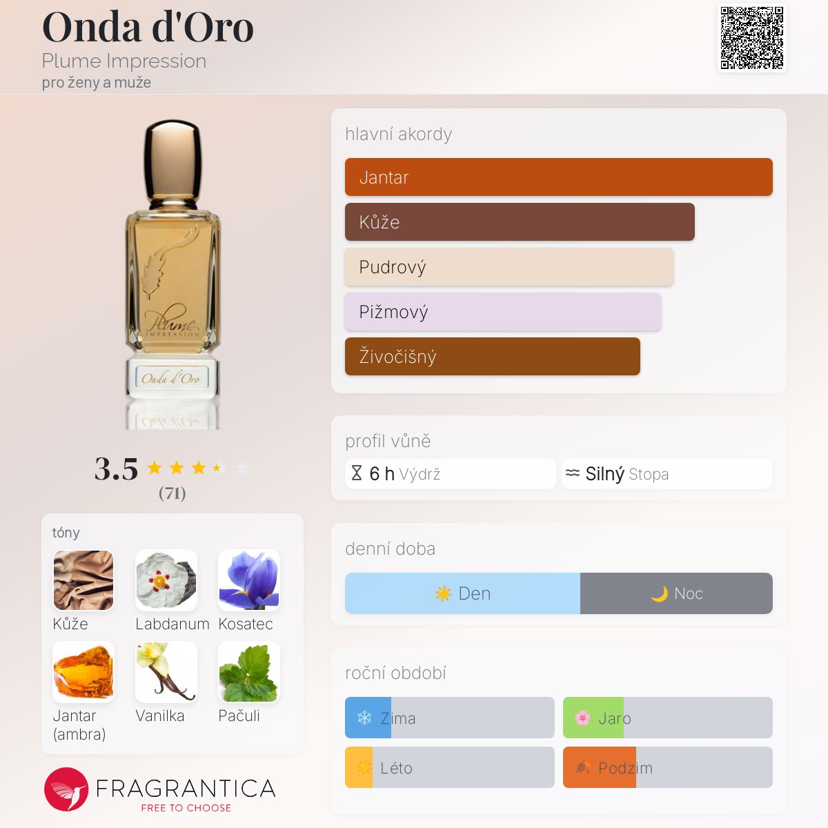 Onda d'Oro podle Plume Impression je Leather vůně pro ženy a muže. Onda d'Oro byl/a uveden/a v roce 2024. "Nosem" za touto vůní je Alexis Dadier. Vrchní tóny jsou Labdanum a Jantar (ambra); střední tóny jsouKůže a Kosatec ; základní tóny jsou Vanilka, Pačuli a Pižmo.