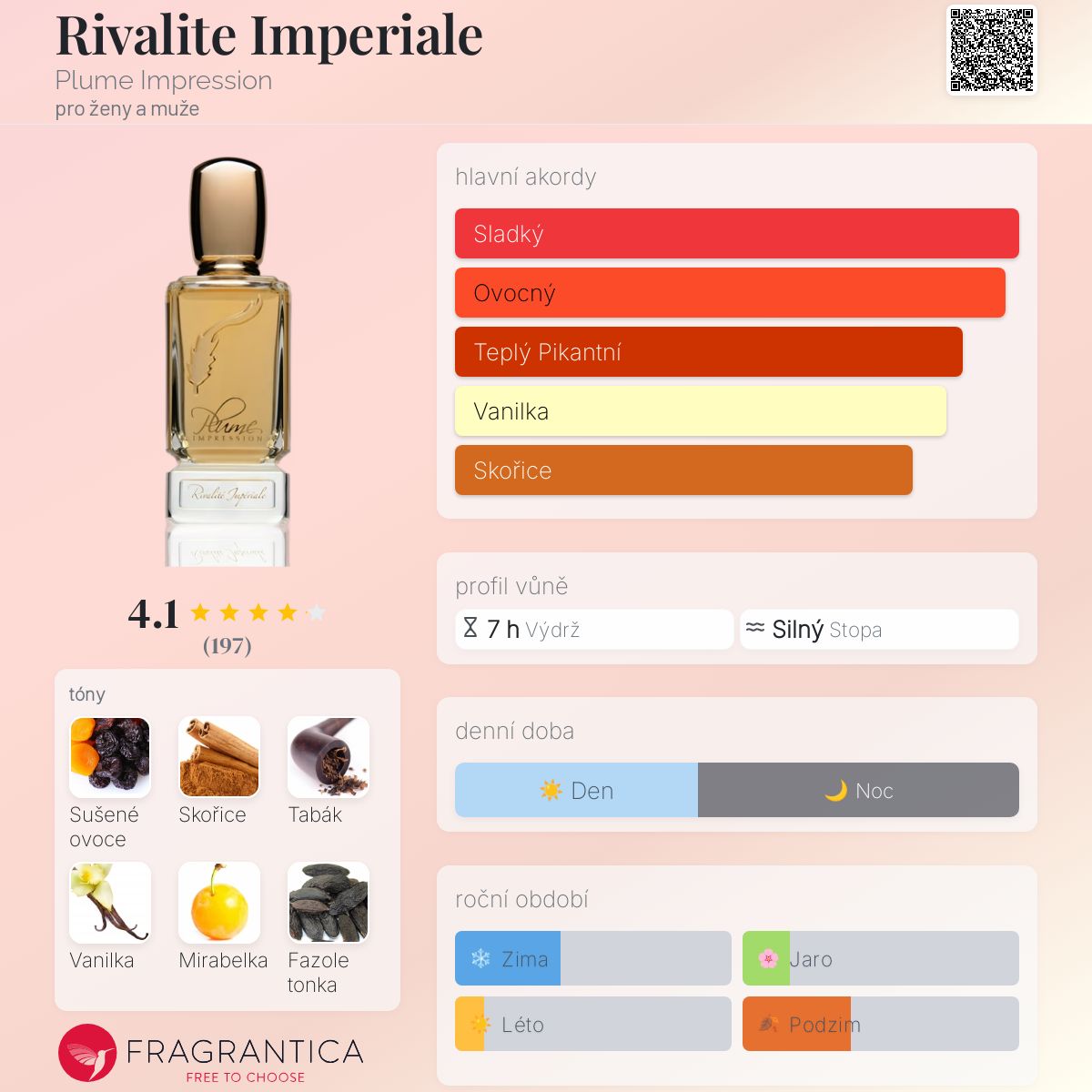 Rivalite Imperiale podle Plume Impression je Orientální Spicy vůně pro ženy a muže. Rivalite Imperiale byl/a uveden/a v roce 2019. "Nosem" za touto vůní je Dalia Izem. Vrchní tóny jsou Sušené ovoce, Skořice a Mirabelka; střední tóny jsouTabák, Fazole tonka a Pačuli ; základní tóny jsou Vanilka, Jantar (ambra) a Santalové dřevo.