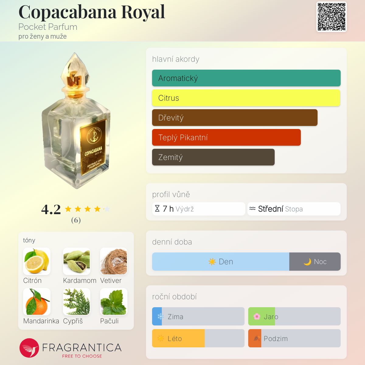 Copacabana Royal podle Pocket Parfum je Citrus Aromatic vůně pro ženy a muže. Copacabana Royal byl/a uveden/a v roce 2021.