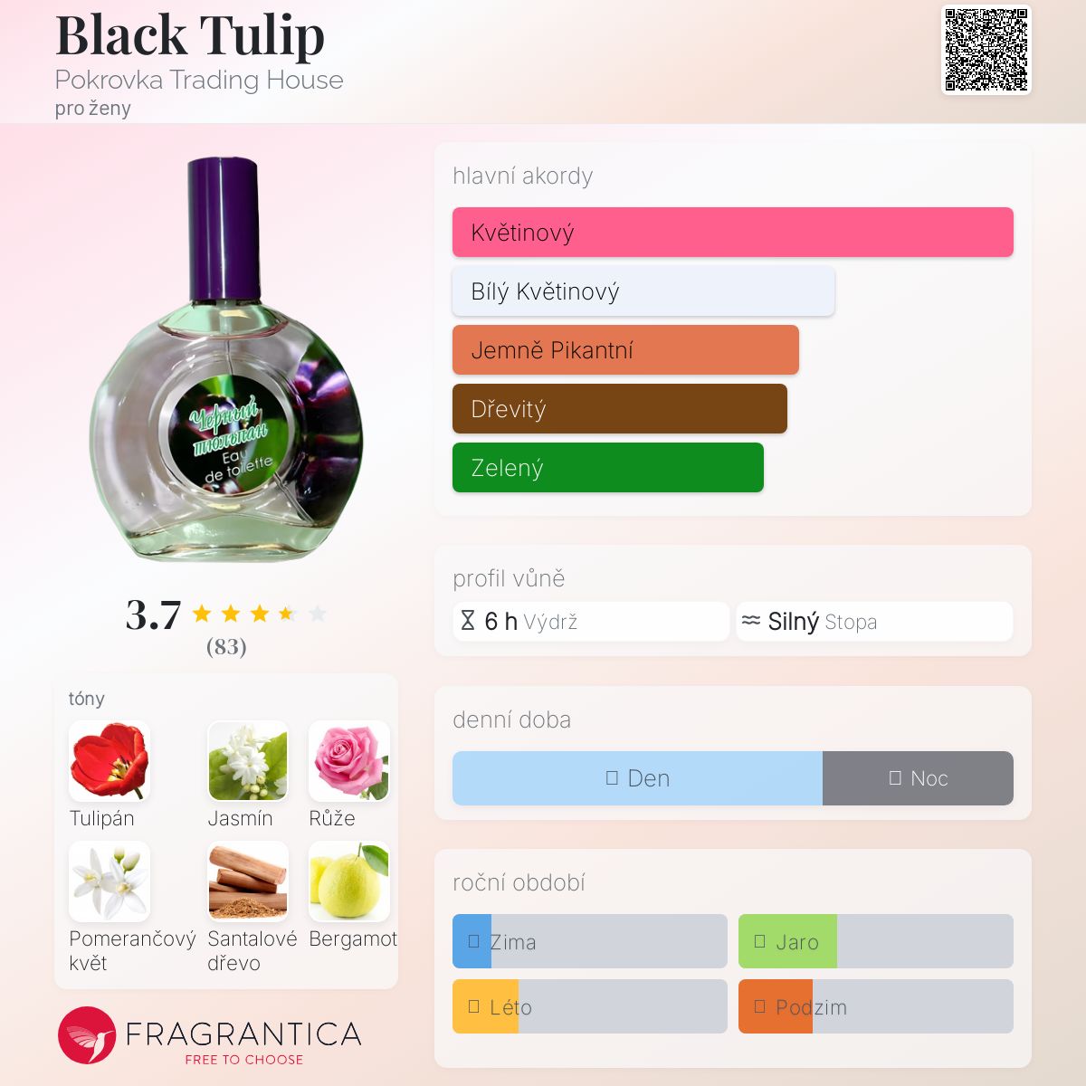 Black Tulip podle Pokrovka Trading House je Floral vůně pro ženy. "Nosem" za touto vůní je Marina Nikitina. Vrchní tóny jsou Tulipán a Bergamot; střední tóny jsouJasmín, Růže a Pomerančový květ ; základní tóny jsou Santalové dřevo a Cedr.