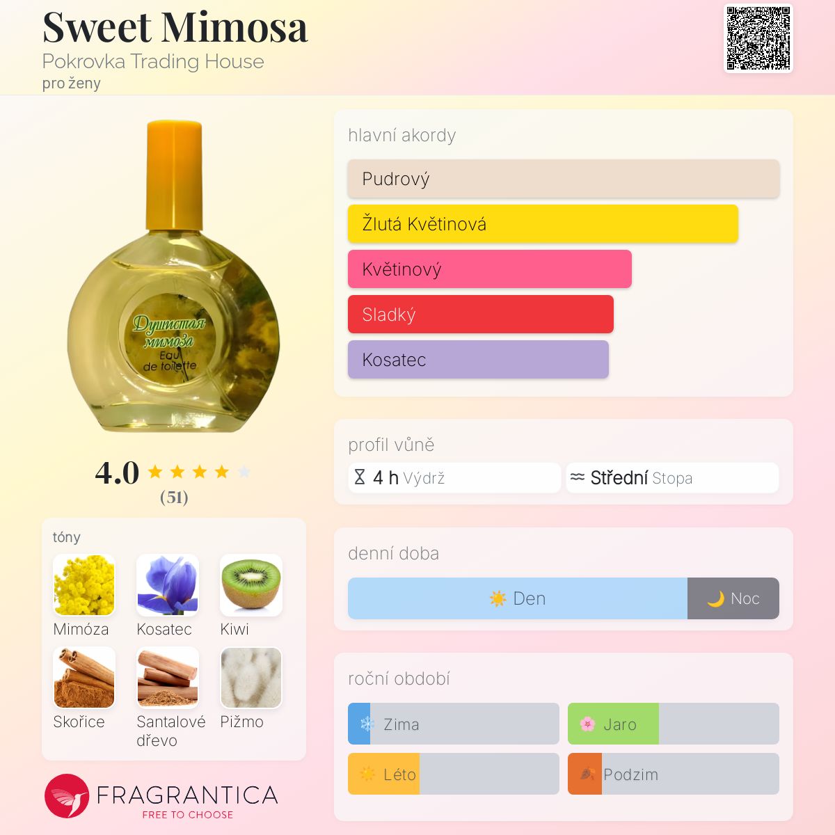 Sweet Mimosa podle Pokrovka Trading House je Floral vůně pro ženy. "Nosem" za touto vůní je Marina Nikitina. Vrchní tóny jsou Kiwi a Grapefruit; střední tóny jsouMimóza, Kosatec, Skořice a Růže ; základní tóny jsou Santalové dřevo a Pižmo.