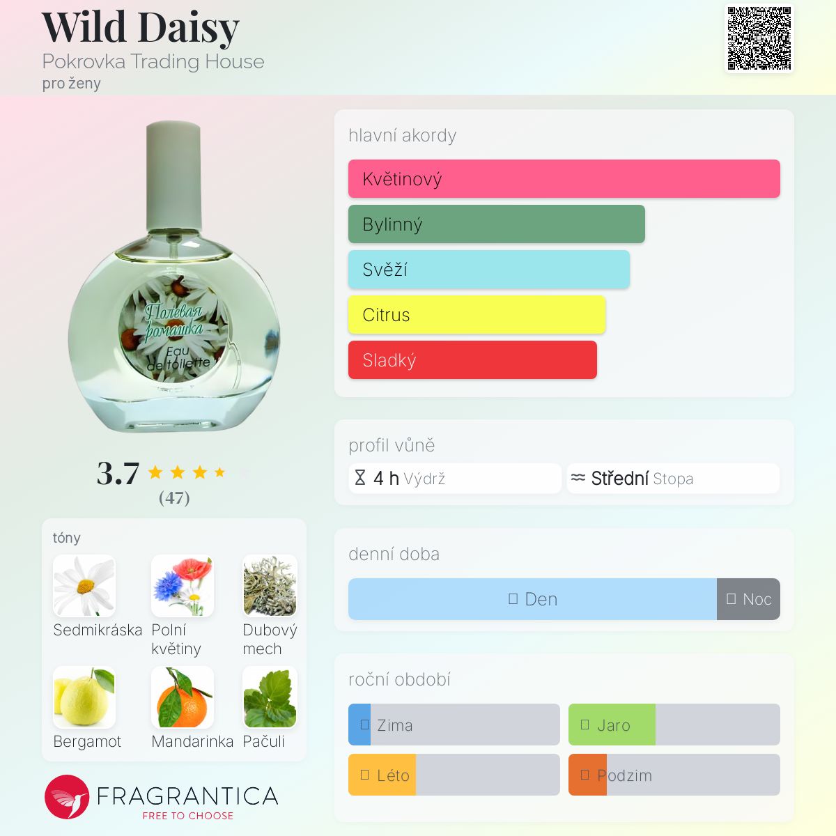 Wild Daisy podle Pokrovka Trading House je Floral vůně pro ženy. "Nosem" za touto vůní je Marina Nikitina. Vrchní tóny jsou Bergamot a Mandarinka; střední tóny jsouSedmikráska, Polní květiny a Růže ; základní tóny jsou Mech a Pačuli.