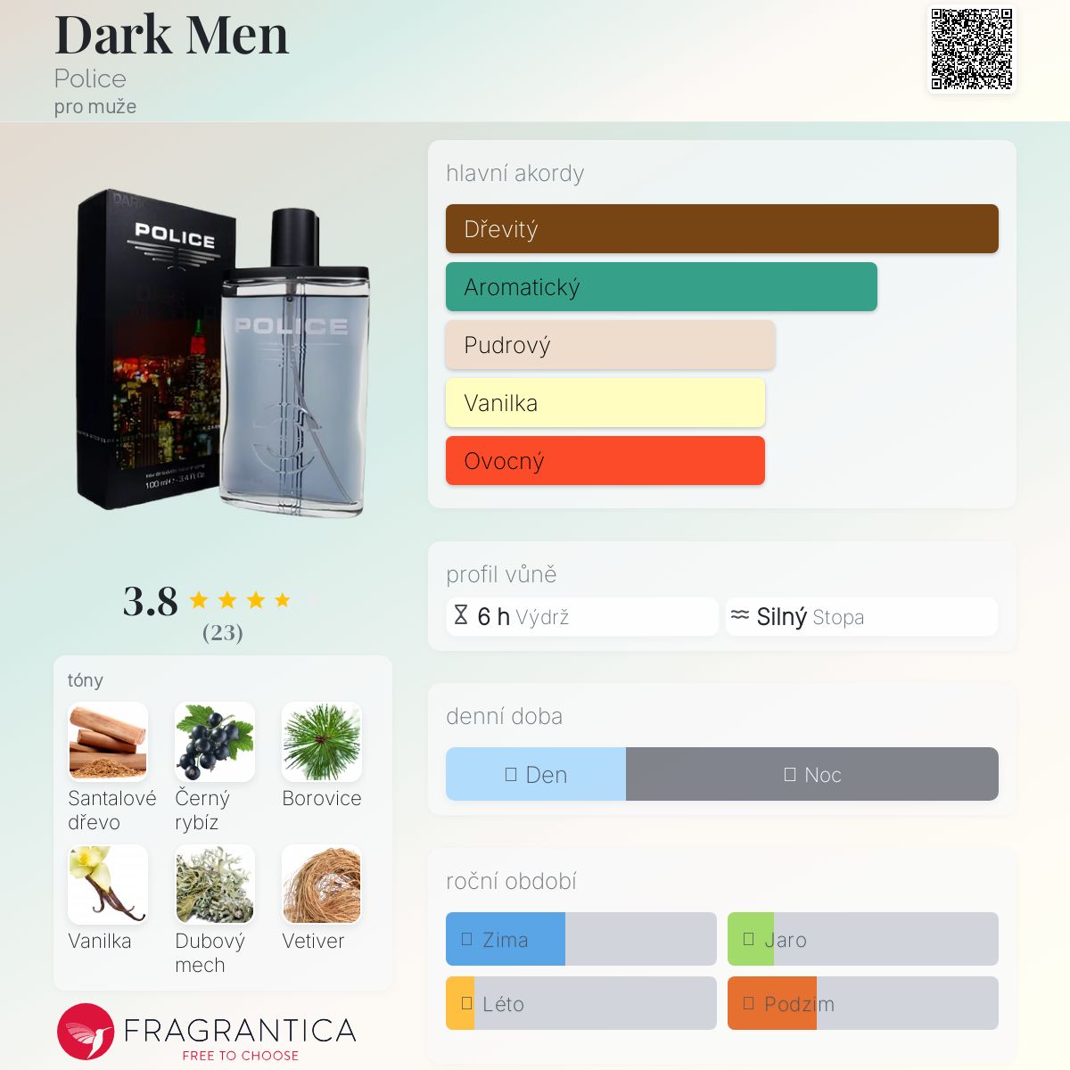 Dark Men podle Police je Orientální Fougere vůně pro muže. Dark Men byl/a uveden/a v roce 2002. Vrchní tóny jsou Černý rybíz, Jalovcové bobulky, Bergamot a Levandule; střední tóny jsouBorovice, Dubový mech, Pelargónie a Jasmín ; základní tóny jsou Santalové dřevo, Vanilka, Vetiver, Pižmo a Jantar (ambra).